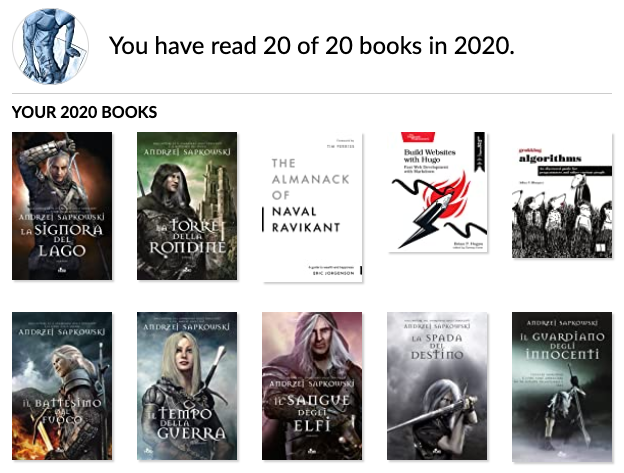 Inaspettatamente sono riuscito a completare il mio almost-absolutely-pointless obiettivo di lettura per il 2020. In un articolo del mese scorso accennavo di essere in ritardo, ma, come si può notare dallo screenshot, sono stato salvato dallo strigo Geralt di Rivia, aka The Witcher.