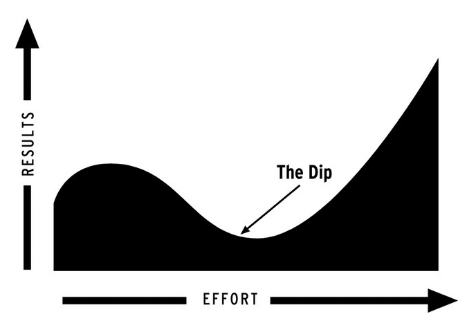 La curva Dip — “avvallamento” — è il cuore del discorso e, infatti, dà il titolo al libro. Secondo Godin, quasi tutto ciò che vale la pena fare nella vita è controllato dal Dip. (A pretty bold statement, if you ask me.)