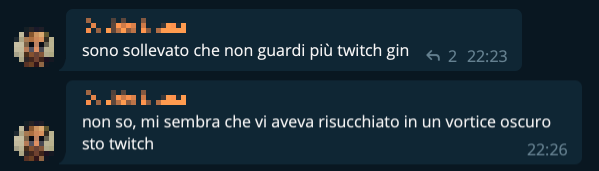 Qualche giorno fa, in un gruppo Telegram con i miei amici, uno di loro diceva di essere sollevato del mio distacco dal vortice oscuro di Twitch.