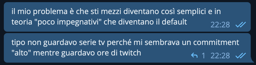 In particolare, anche se ero consapevole della situazione, ho continuato a buttare gran parte del mio tempo libero sui social, fintanto che li ho avuti sempre disponibili. Ho rimandato e rimandato alcune serie che volevo vedere sebbene ogni sera passassi ore su Twitch.