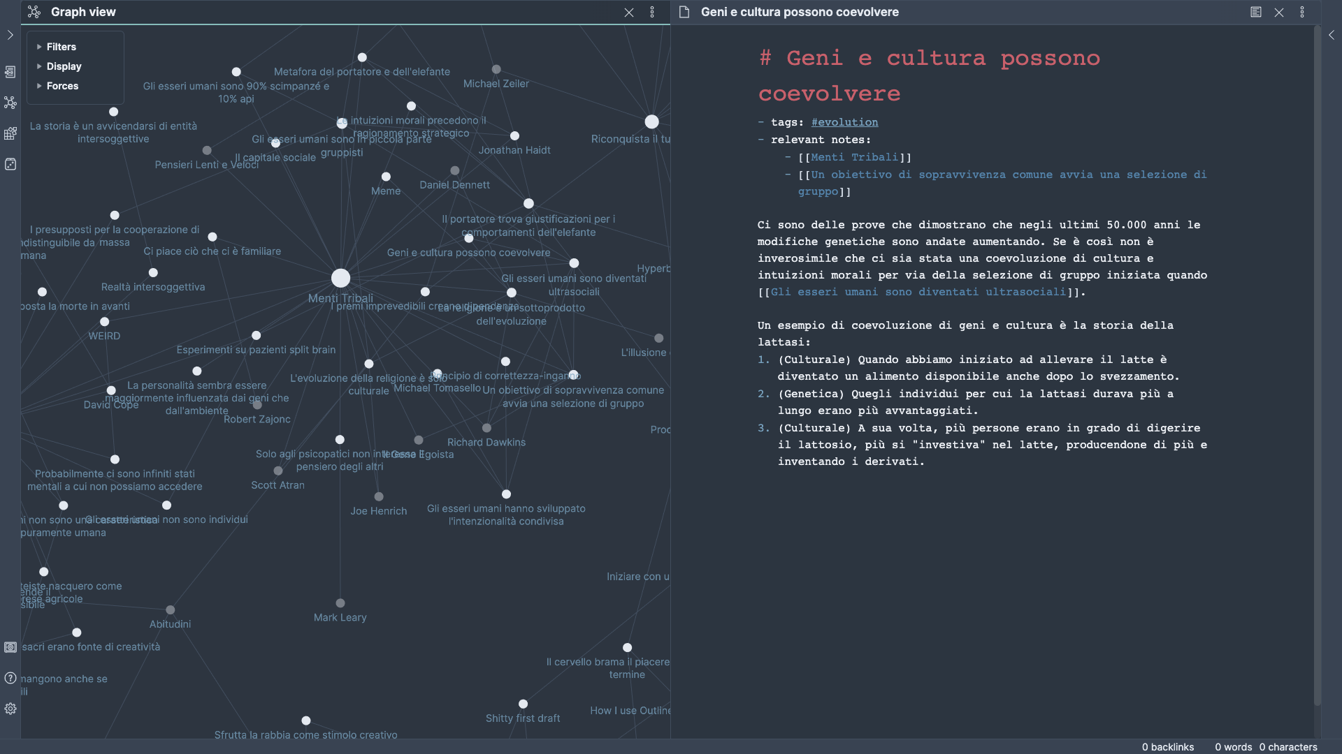 Una schermata di Obsidian: a destra una nota permanente e a sinistra un pezzo del grafico delle connessioni tra le mie note