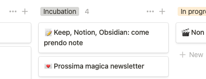 Tutte le annotazioni che riguardano cose da fare o idee per i miei progetti vanno a finire su Notion. Per esempio, se ho annotato un’idea per un articolo che voglio scrivere, la andrò a riportare dentro il relativo progetto.