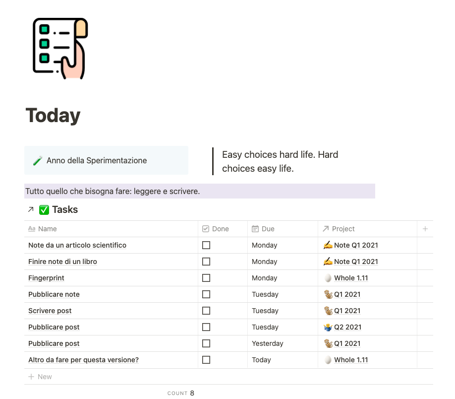 Più nello specifico sto seguendo una versione (molto) approssimativa del metodo PARA. Ogni progetto ha una sua pagina all’interno mio workspace Notion ed è connesso alle attività rilevanti. La domenica sera, durante la mia weekly review, riguardo cosa ho portato a termine e pianifico cosa fare la settimana successiva. Di giorno in giorno poi, mi basta controllare la mia schermata Today che mi mostra, tra le altre cose, i task che devo ancora portare a termine.
