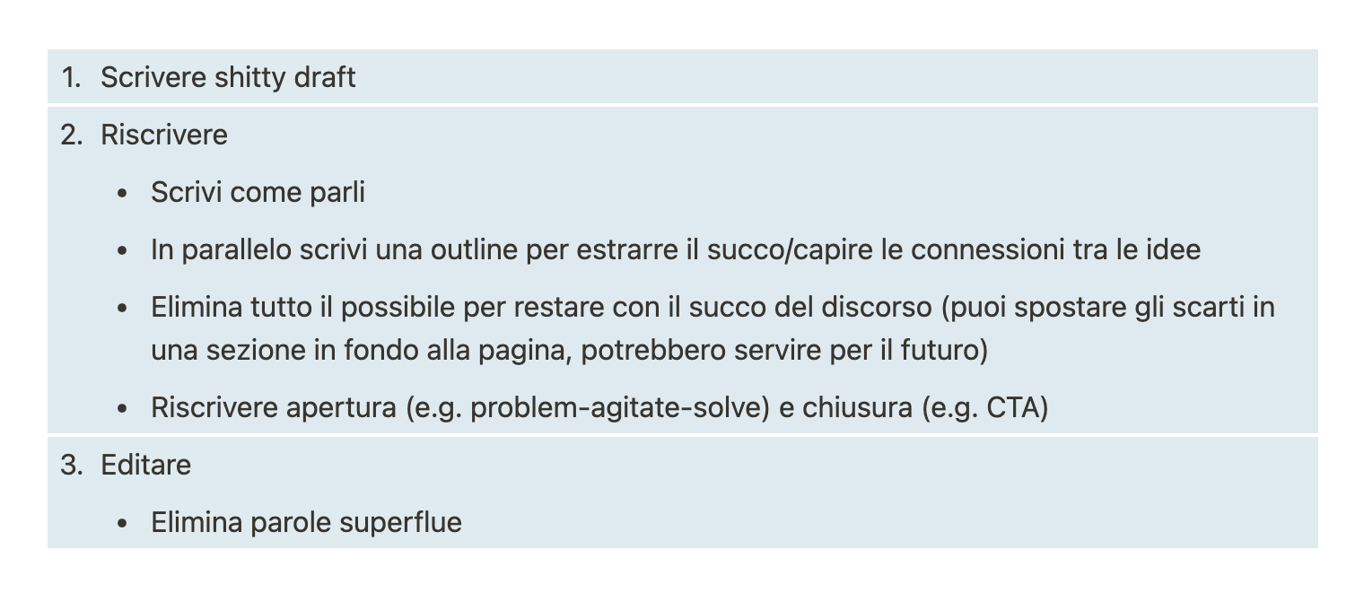 L’obiettivo di questa fase non è di scrivere il testo finale. Non è il momento di perdere tempo a scegliere la forma più corretta o le parole più adatte. Questo è il momento di trasferire le idee sul foglio.
