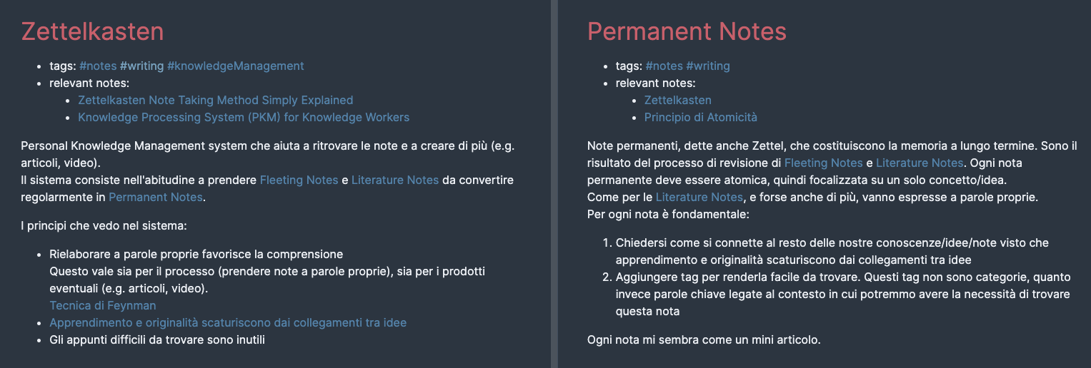 Due mie note a titolo di esempio. Invece che creare una singola nota con tutte le informazioni sullo Zettelkasten, ne ho creata una per il metodo e una per ogni componente del sistema, tipo quella sulle Permanent Notes